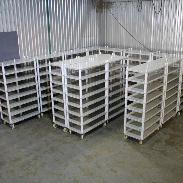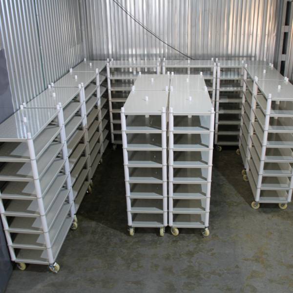 Стеллаж из полипропилена на колёсах, предназначен для хранения продуктов питания, не впитывает и не выделяет запахи, не меняет физико-химические и органолептические свойства продуктов и веществ.